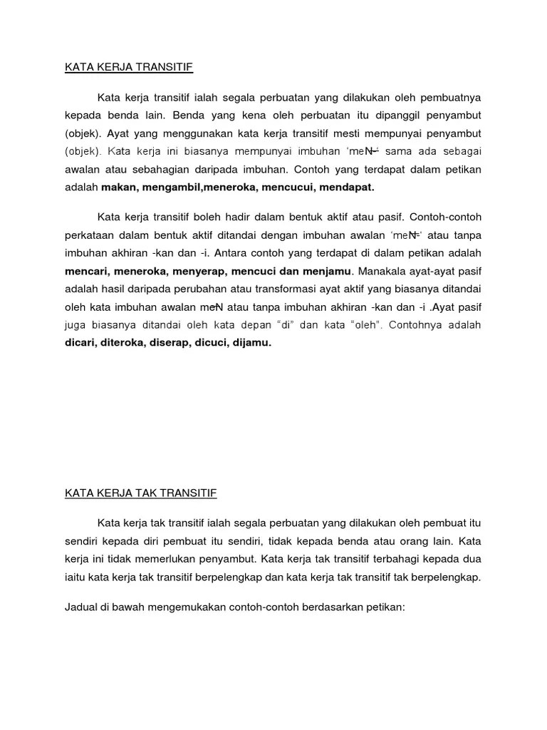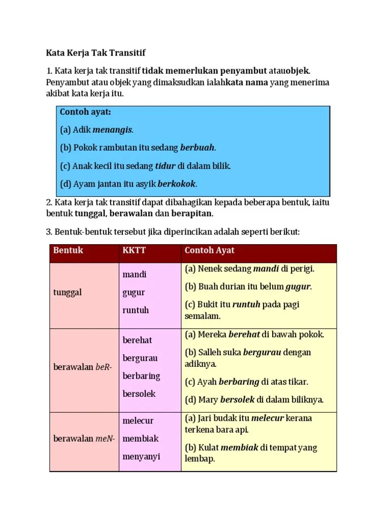 Kata kerja aktif tak transitif berpelengkap • kata kerja aktif tak transitif . ٢٩ ربيع الأول ١٤٣٤ هـ. Kata kerja tak transitif tanpa pelengkap ialah kata kerja yang boleh berdiri sendiri tanpa objek atau penyambut. I contoh ayat yang menggunakan kkat: Kata kerja transitif boleh dibuat dalam bentuk ayat aktif dan ayat pasif. Kata kerja ini boleh dikenal pasti melalui imbuhannya seperti contoh yang.